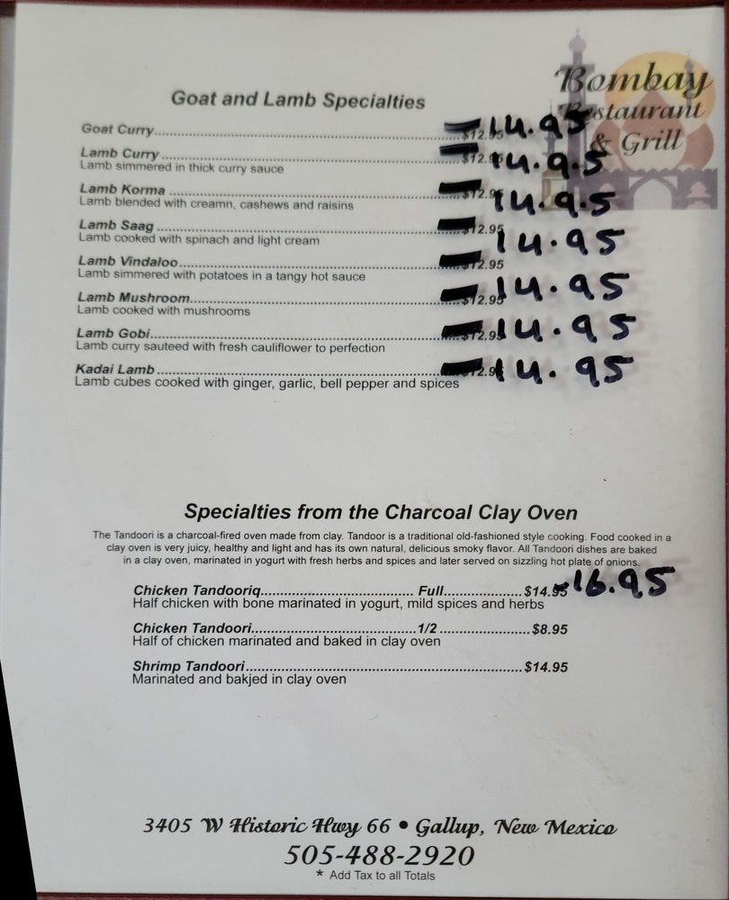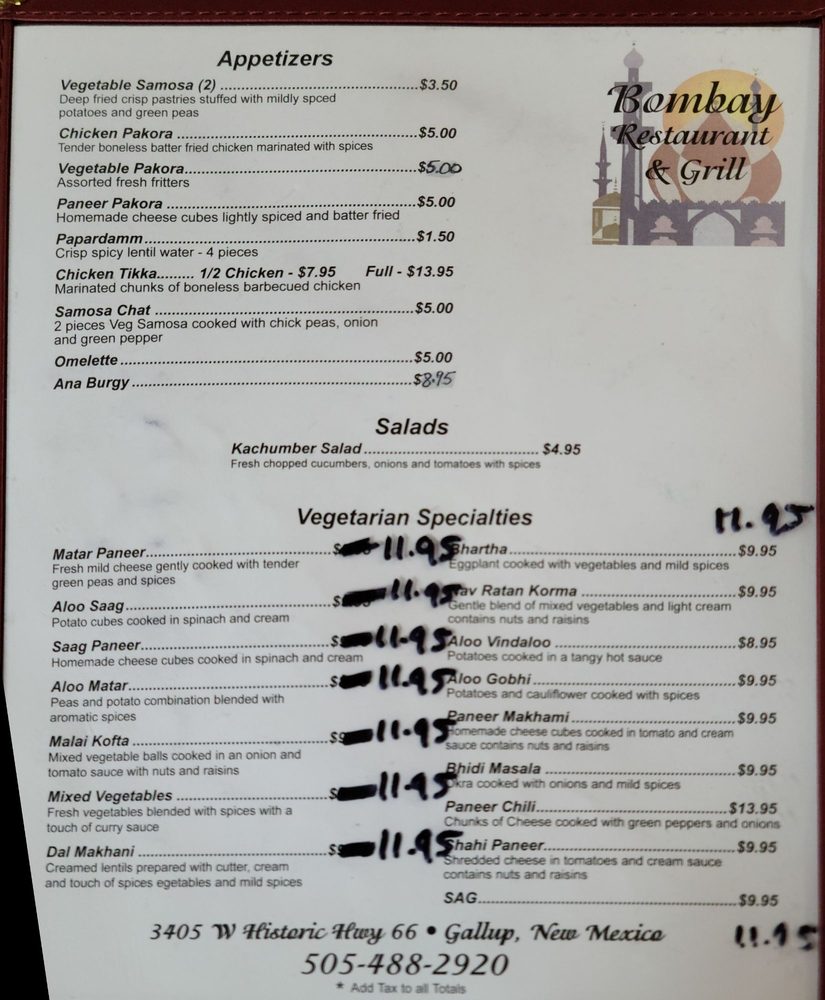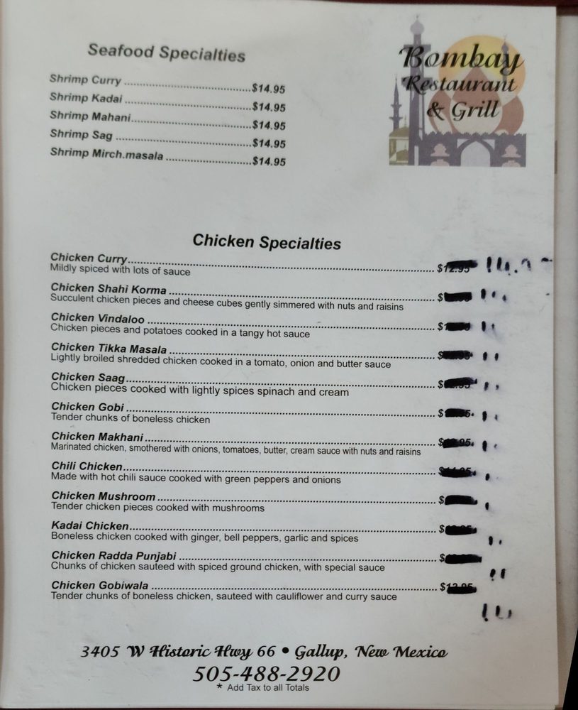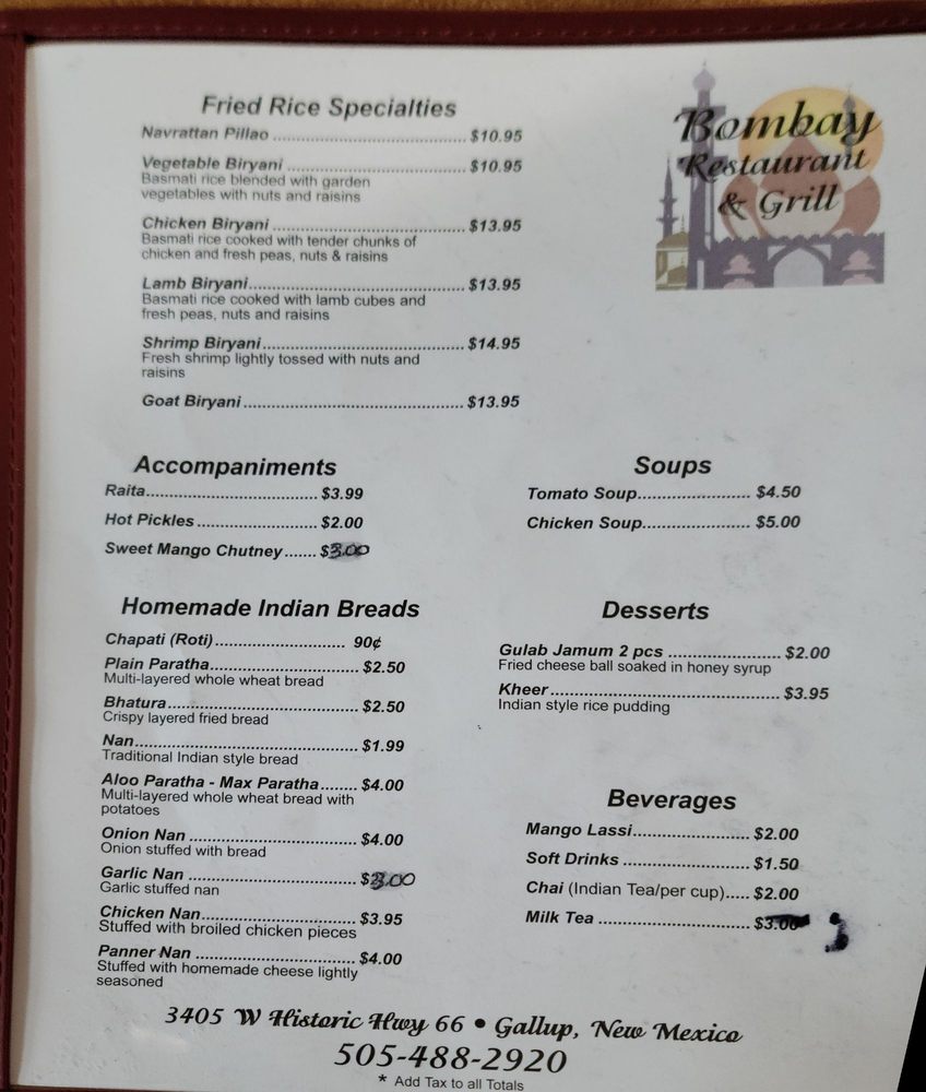 Located in Gallup, NM, Bombay Grill And Buffet offers a delightful array of authentic Indian cuisine, perfect for those craving flavorful and aromatic dishes. The restaurant provides a mix of classic North Indian and Punjabi-style dishes, such as the Murg Curry Shahajam, Murg Tikka Makhani, and Saag Paneer. Customers rave about the generous portion sizes, reasonable prices, and efficient service. The menu features various options for vegans and vegetarians, alongside popular items like the Butter Chicken and Garlic Naan. While the ambience may not be the main highlight, the flavorful food and friendly staff make this spot a must-visit for Indian food enthusiasts. Don't miss out on the Masala Chai tea to complement your meal at this hidden gem in Gallup.